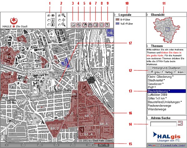der Referenzkarte (11) kann man sich grob orientieren, wo sich der gewählte Ausschnitt im Gesamtgebiet der Stadt befindet. Außerdem kann man sich mit einem Klick in die Referenz-Karte sehr schnell durch das Gesamtgebiet unter Beibehaltung des aktuellen Maßstabes bewegen.